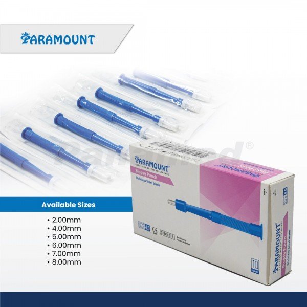 The Paramount Biopsy Punch is a hollow, circular scalpel used in skin biopsies to obtain a full-thickness skin specimen by cutting into a skin lesion. It is commonly used in the evaluation of cutaneous neoplasms, pigmented lesions, and chronic skin disorders.